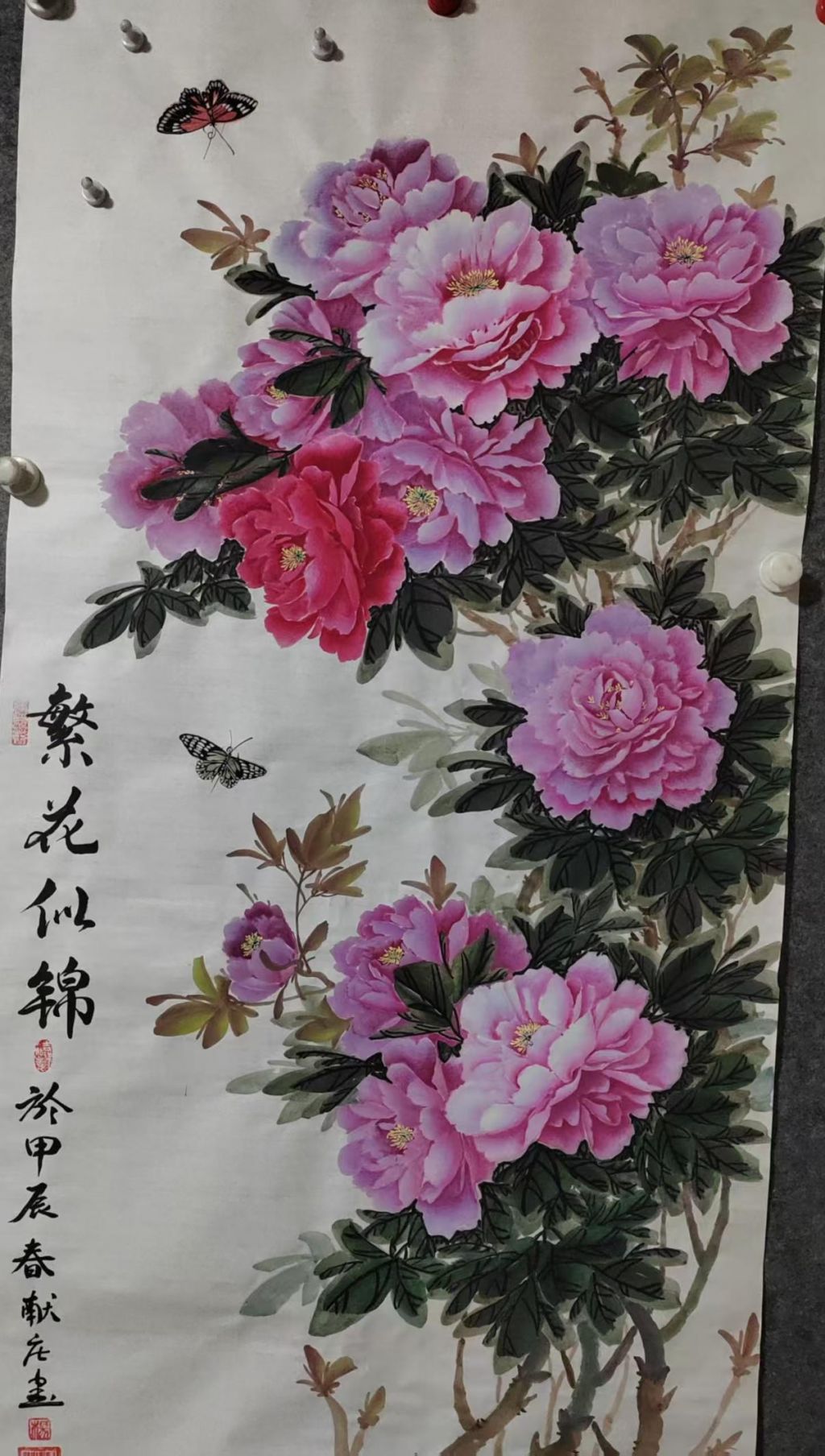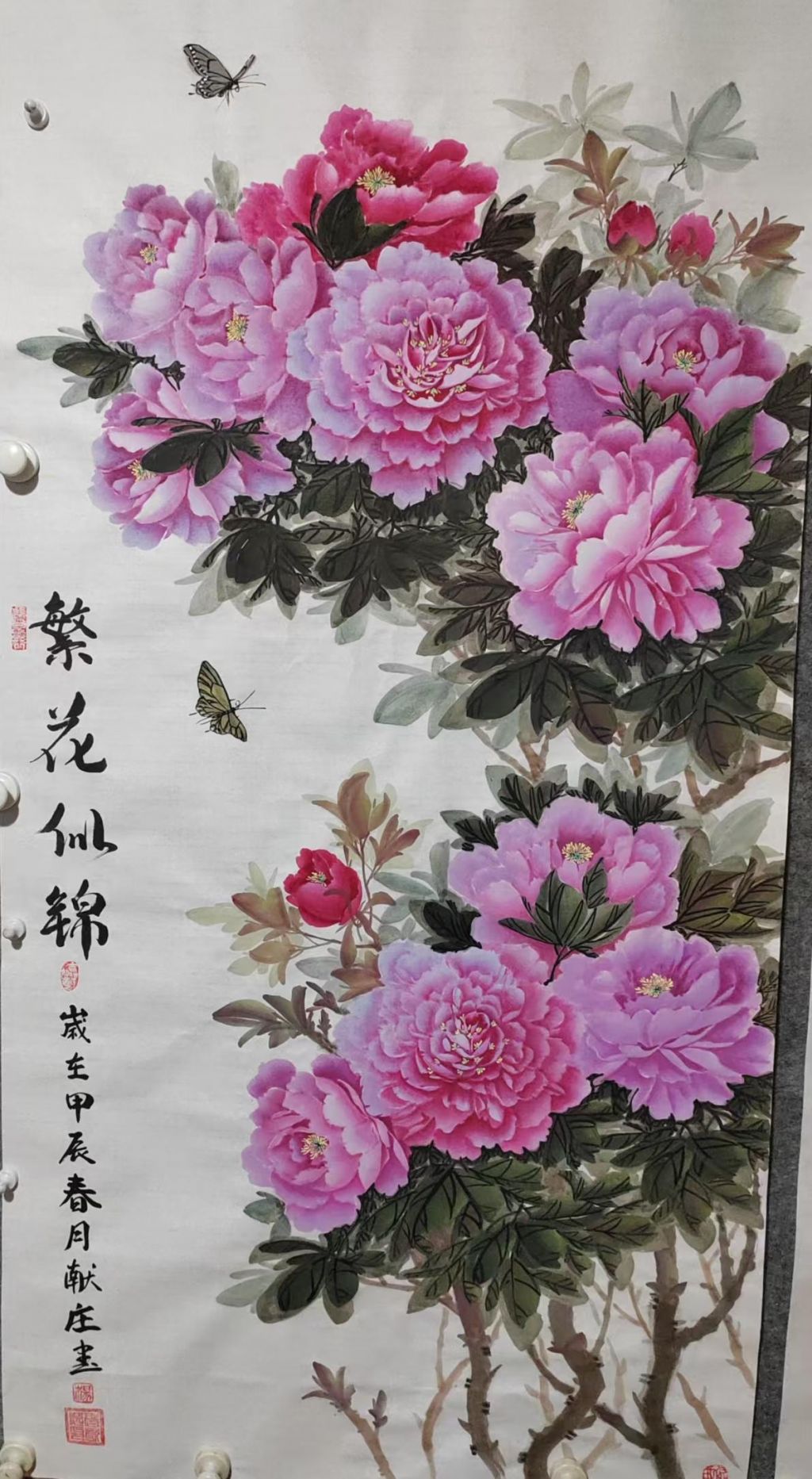 首先,从整体的构图来看,杨老师巧妙地将多株盛开的牡丹花巧妙地交织在一起,形成一个富有层次感的画面。每朵牡丹花都绽放得恰到好处,色彩饱满,形态生动,富有生命力。整体的布局既不失对称,又有一些微妙的变化,使得画面既充满了生动的动感,又具备了一种和谐的视觉效果。通过花朵的大小、花色的搭配,杨老师成功地表达了“富贵”二字的含义,整个作品透露出一种繁荣、富贵的气息。