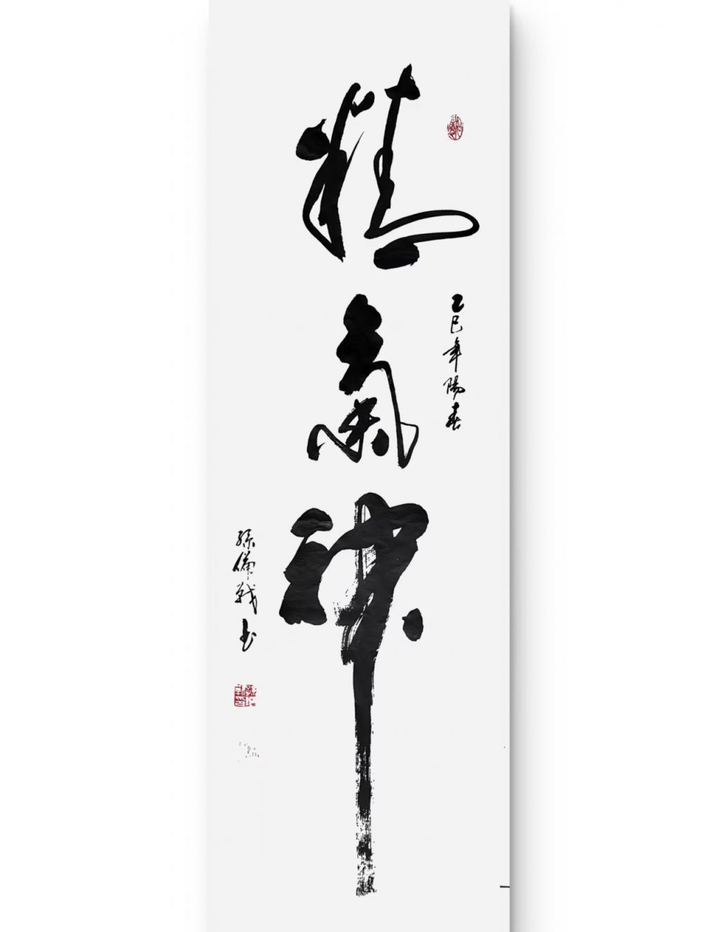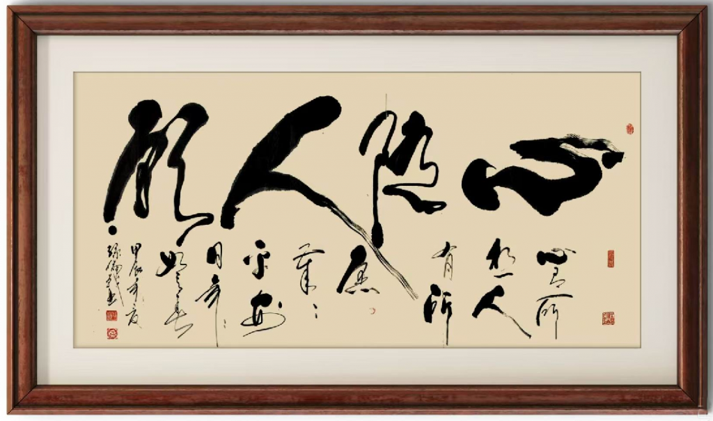 “精气神”作为书法作品的主题,通常代表着一个人内心的专注、灵气以及深厚的修养。而从这幅作品中,我们能感受到作者在用笔上所传达出的气韵和灵动。孙老师的用笔非常讲究,笔锋轻重、粗细变化分明,整体给人一种平衡而又不拘一格的美感。这种风格不仅仅体现了传统书法的技法,更有一种现代的自由与张扬。特别是书写方式的大胆运用,显示出一种超越常规的艺术追求。