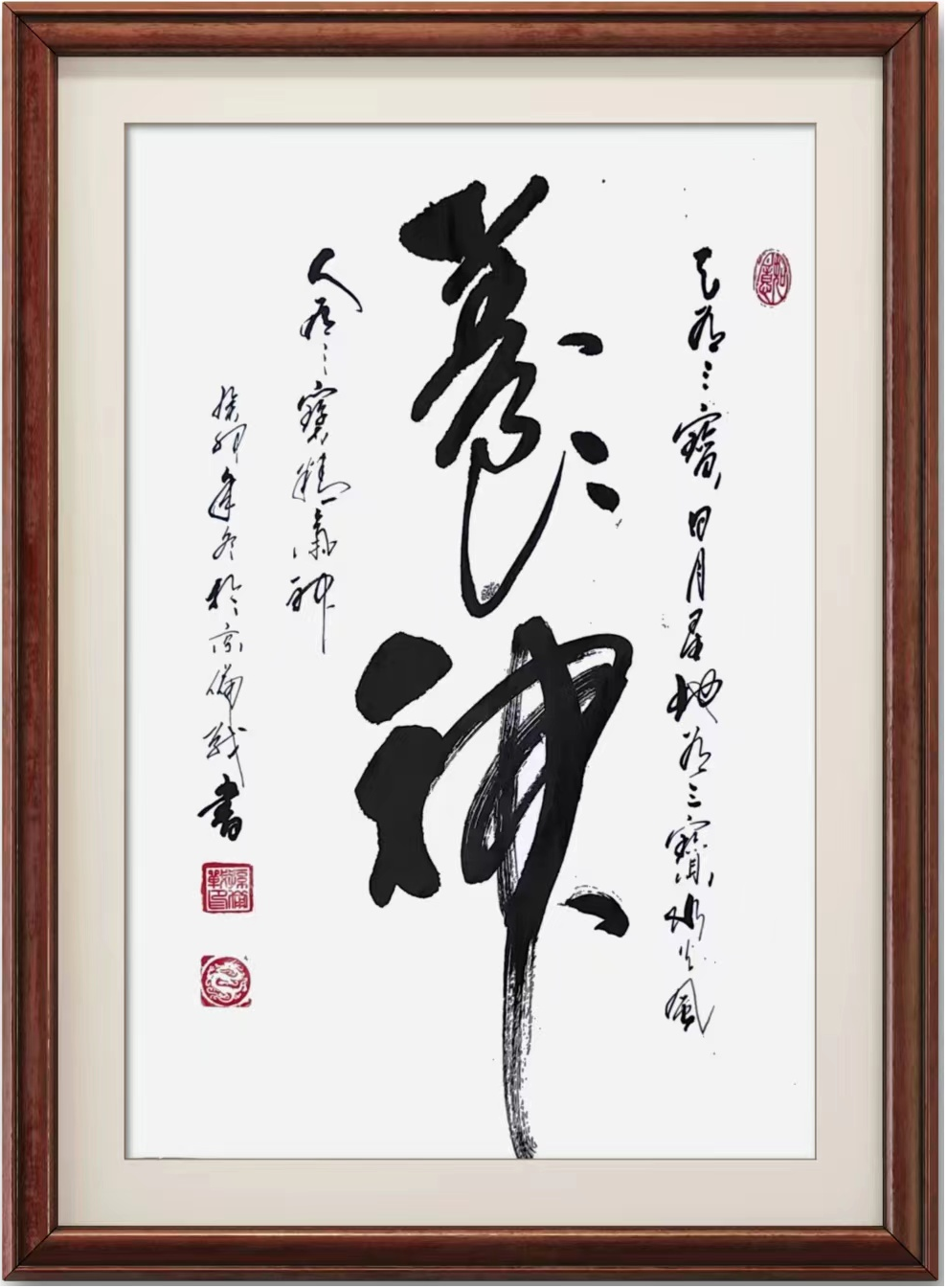 首先,作品的线条勾画中透露出一种气势非凡的表现力。每一笔都像是在纸上展开一场舞蹈,笔力奔放却不失秩序。特别是在字形的处理上,字与字之间保持了恰到好处的间距,使得每个字都能够独立且自然地展现其气韵。尤其是“神”字的最后一笔,从左到右一笔流畅如水,笔画的拖尾和力道完美结合,仿佛在呼应着主题的精神气质。