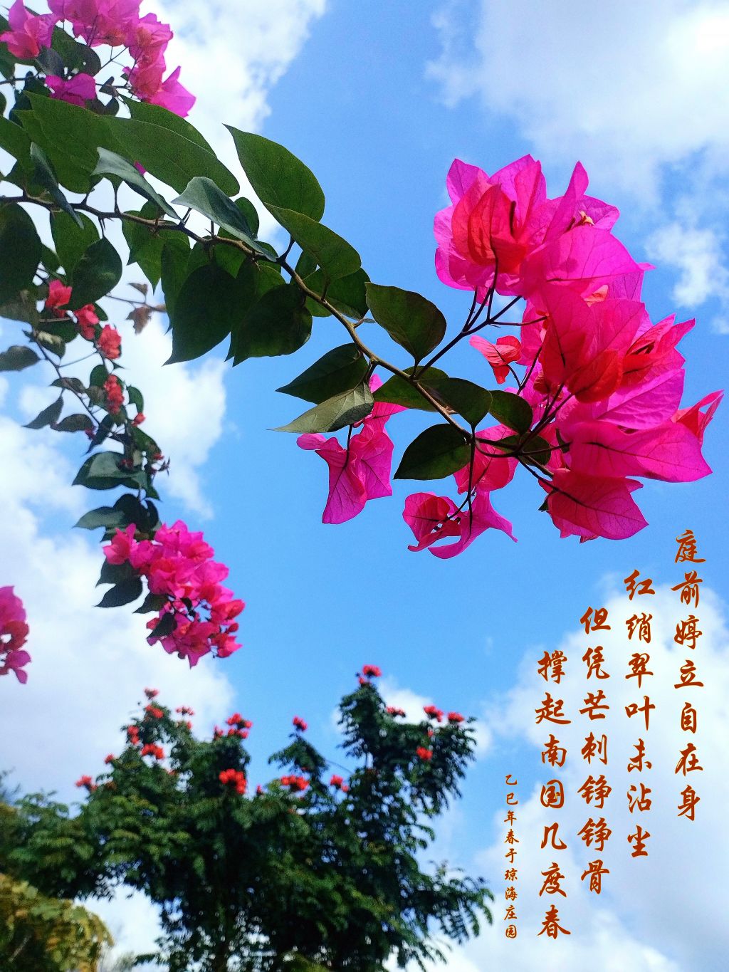 接下来的“但凭芒刺铮铮骨,撑起南国几度春。”则通过极具力量感的语言,展现了三角梅顽强的生命力。“芒刺铮铮骨”极具张力,表达了三角梅的坚韧和不屈,仿佛能听到那芒刺碰撞的声音,透过花朵的外表,显示出其内在的力量。而“撑起南国几度春”则带有一种自豪与期许,表现了三角梅在南方大地上生长、盛放的情景,成为春天的一部分,传递出一种勃勃生机。