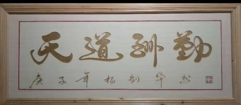 杨剑华自幼便对毛笔书法怀有浓厚兴趣。早在初中一年级时,他就在学校全年级毛笔书法比赛中崭露头角,一举夺得第一名。凭借扎实的书法功底,周边村民在举办红白喜事时,常常邀请他书写对联。在此过程中,杨剑华不仅展现出书法技艺,还发挥创意,自创了许多对联。例如他创作的弥月联“新生弥月欢弥月;嘉客盈门喜盈门”,以通俗易懂的语言传递出喜庆氛围,极具民间特色。多年来,他的创作主要集中在对联和壁挂作品领域。近年来,杨剑华又开拓新的艺术表达形式,热衷于将写好的书法作品通过手工复刻到木板上,并为自己取艺名“一笔千雕”,还附上联句“磨砺以书,学无止境磨能耐;乃锋而试,专注深刻乃功夫”,以此表达自己对书法艺术的执着追求与深刻感悟。