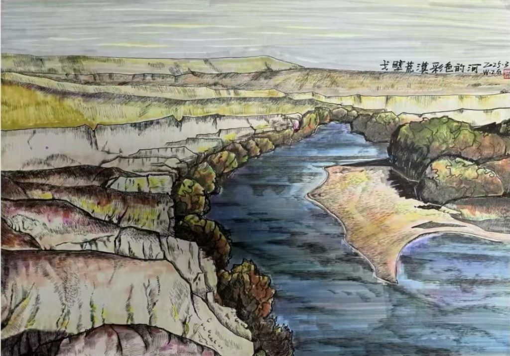 在色彩的运用上,王老师展现了高超的艺术造诣。戈壁荒漠的岩石、黄土层被赋予了丰富的色彩,而不仅仅是单调的土黄色。画面中可以看到赭石、紫色、褐色、青绿等色调交错出现,这不仅突出了戈壁地貌的多样性,也使画面更富层次感。而河流的部分则采用了深蓝、青色和少许亮色点缀,既展现了流水的清澈,也与周围的荒漠形成鲜明对比,突出了“彩色的河”这一主题。这种大胆的色彩搭配,使作品在视觉上极具吸引力,仿佛大自然在这片荒凉之地上施展了一场神奇的色彩魔法。