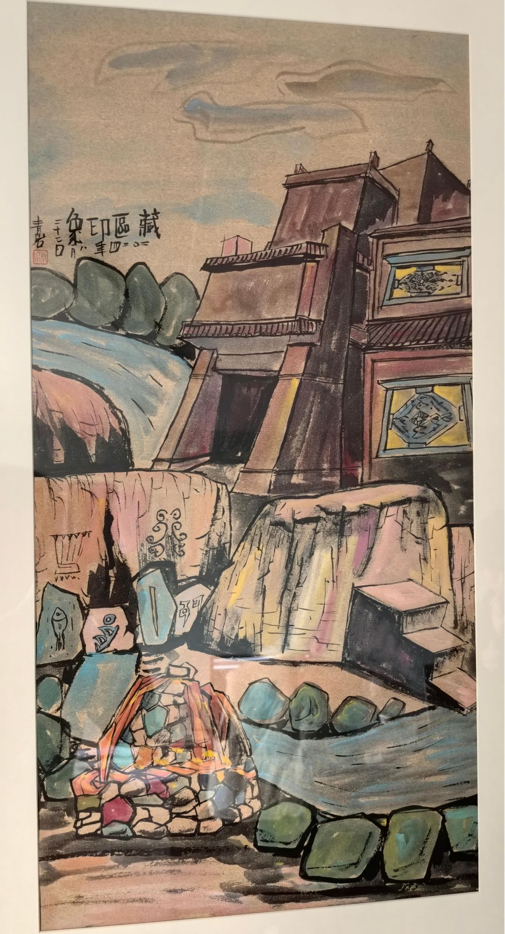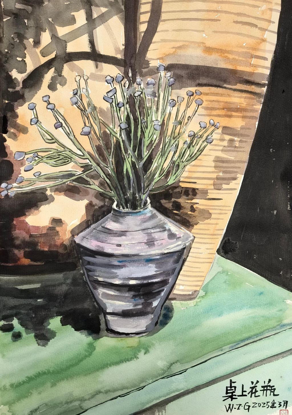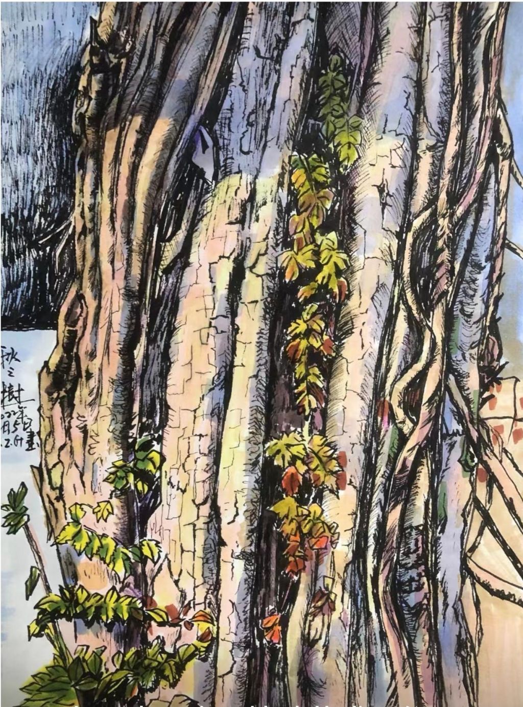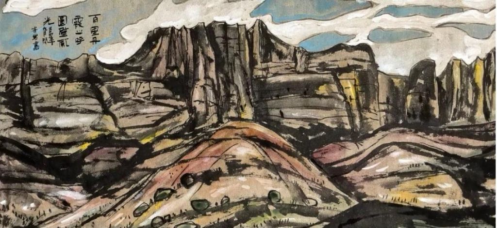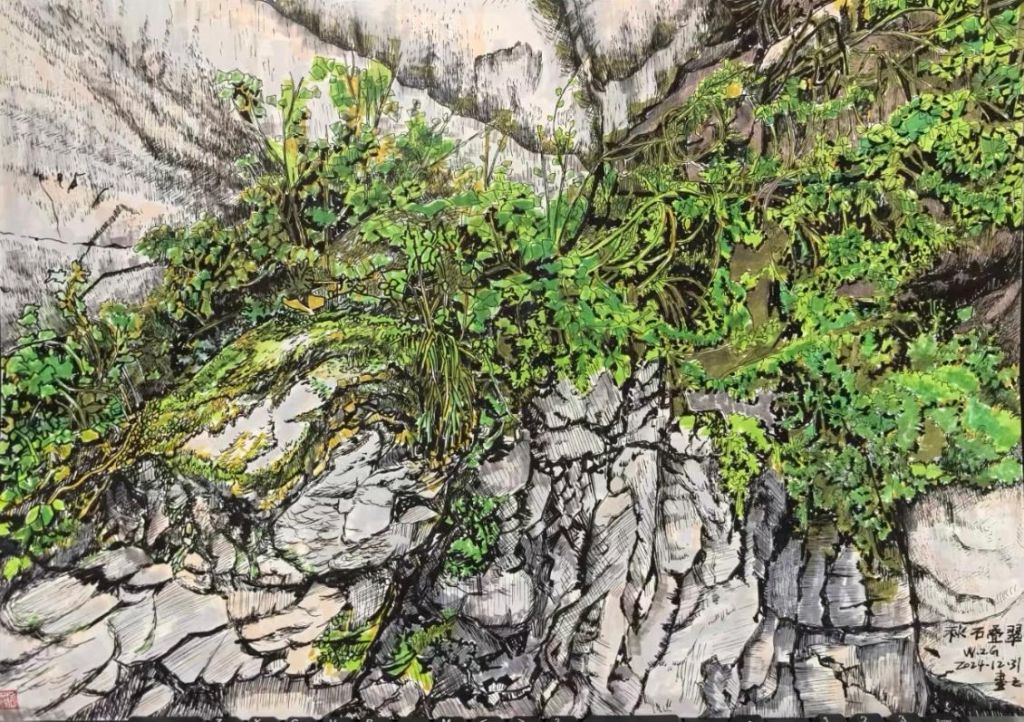 此外,作品的笔触与线条极具表现力,能够看出王老师在技法上的独特探索。远景的山脉、丘陵部分使用了较为柔和的线条勾勒,赋予画面朦胧的空间感,而前景的岩石则采用了更为刚劲、富有力度的线条,呈现出戈壁特有的坚硬质感。特别是在刻画岩石肌理时,王老师巧妙地结合了短线条、斜线、交叉线等多种笔触,使岩石的层理结构表现得既真实又富有装饰性。此外,植被部分的描绘也十分生动,树木和灌丛虽然并非画面主角,但其色彩的点缀起到了很好的调和作用,使整幅作品既充满荒漠的壮美感,又不失自然的灵动气息。