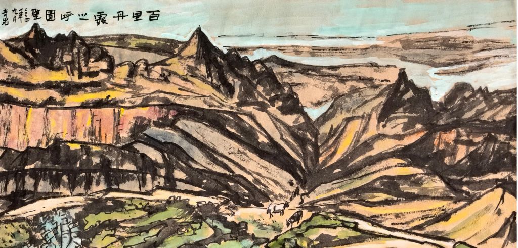 作品的整体构图具有强烈的空间纵深感。画面以一条蜿蜒的河流作为视觉的引导线,使观者的目光随着河道的走势,从画面前方逐渐深入到远方的戈壁丘陵之中,形成了由近及远、层层递进的透视效果。这种构图方式不仅增强了画面的立体感,也让作品更具叙事性,使观者仿佛置身于这片荒漠之中,感受到自然的辽阔与雄浑。