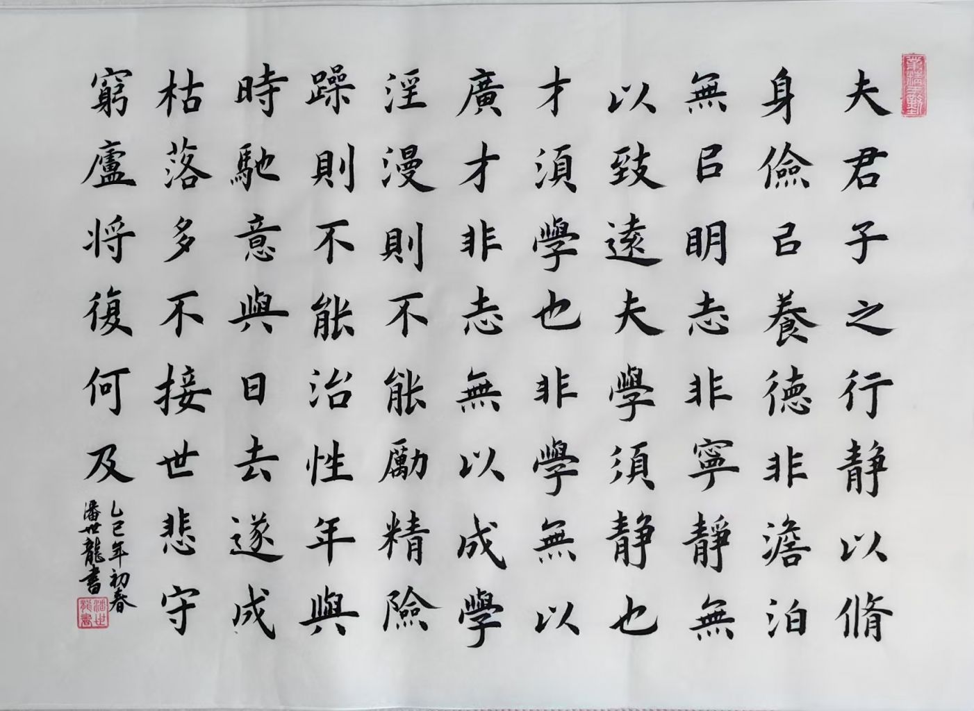 在经年累月的临池实践中,潘世龙深刻领悟到书法艺术的三昧真谛。他认为,在书法创作时,需“以静制动”,只有内心平静如水,方能参透笔意;应“以慢求快”,通过细腻的笔触展现每一处细节,从而达到形神兼备的境界;要“以专破杂”,取法于上乘之作,才能实现融会贯通。经过十余年的精心磨砺,潘世龙尤其擅长欧楷体系,已然掌握“平正中见险绝”的精髓。其笔法方圆结合,刚柔并济,结体严谨规整却又不失灵动活泼。