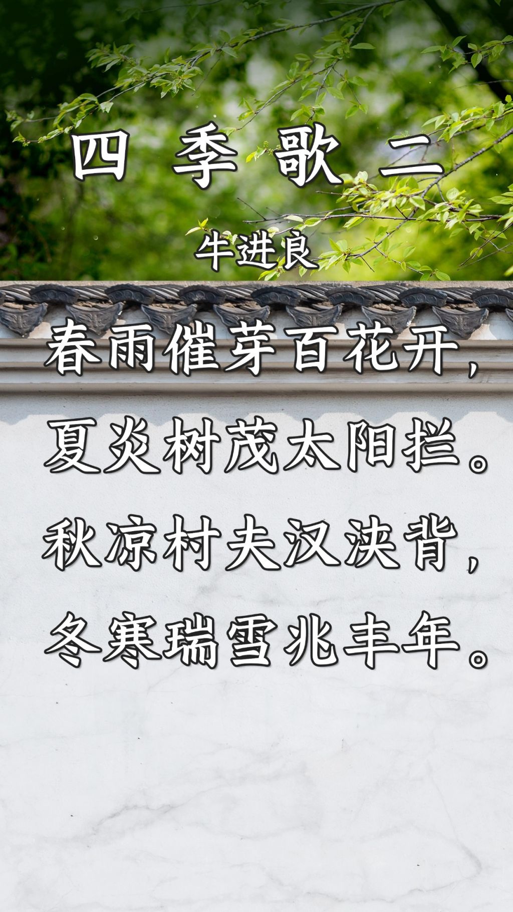牛进良老师的《四季歌二》是一首凝练而鲜活的写景小诗,四季分明,句句直抒自然之美与生活之趣。这首作品以极简的语言结构勾勒出一年四季的不同景象,不仅给人以清新的视觉享受,还传递出一种淳朴的生活哲理与自然和谐的意境,实为一首朴实而动人的佳作。