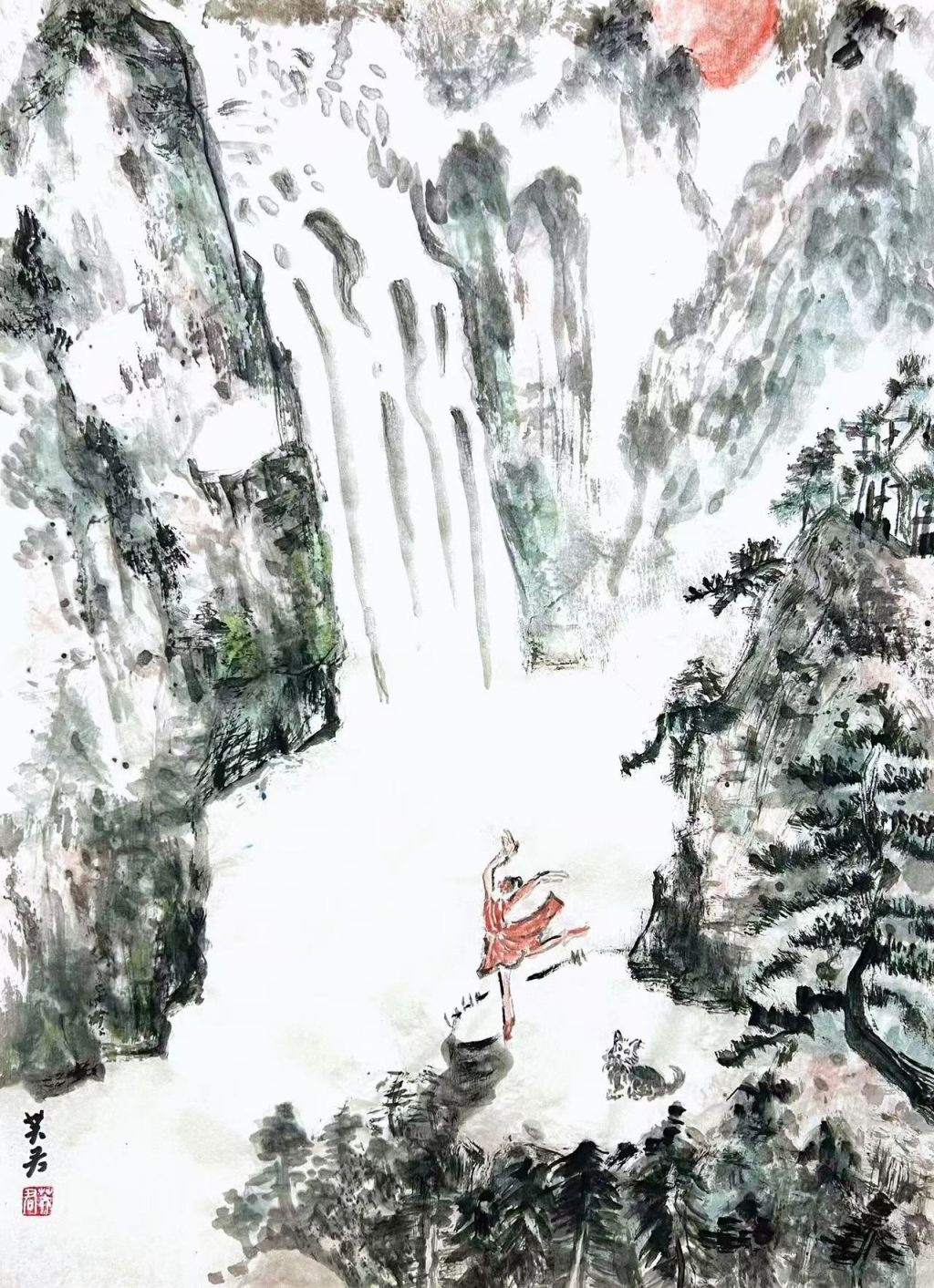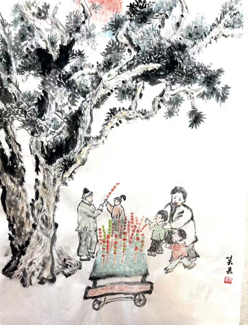 首先,从画面的整体构图来看,王老师巧妙地运用了传统的工笔技法,尤其在人物与背景的刻画上,表现出了娴熟的技艺。树木的勾勒、枝叶的铺陈都充满了生动感与灵动感,呈现出浓郁的笔墨气息。树木的线条饱满且自然,尤其是树干的纹理与枝叶的细致描绘,仿佛让人能够感受到寒冬中的清冷与沉寂。树的上部,隐约有一抹红色,可能象征着节日的热闹与喜庆,与糖葫芦的红色相呼应,增添了一份温暖与喜庆的气氛。